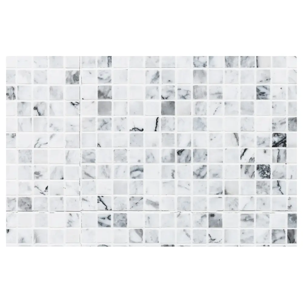 The White Marble Mosaic Wall Tile features small square marble-look pieces arranged in a clean grid pattern and mounted on a mesh backing for easy installation.